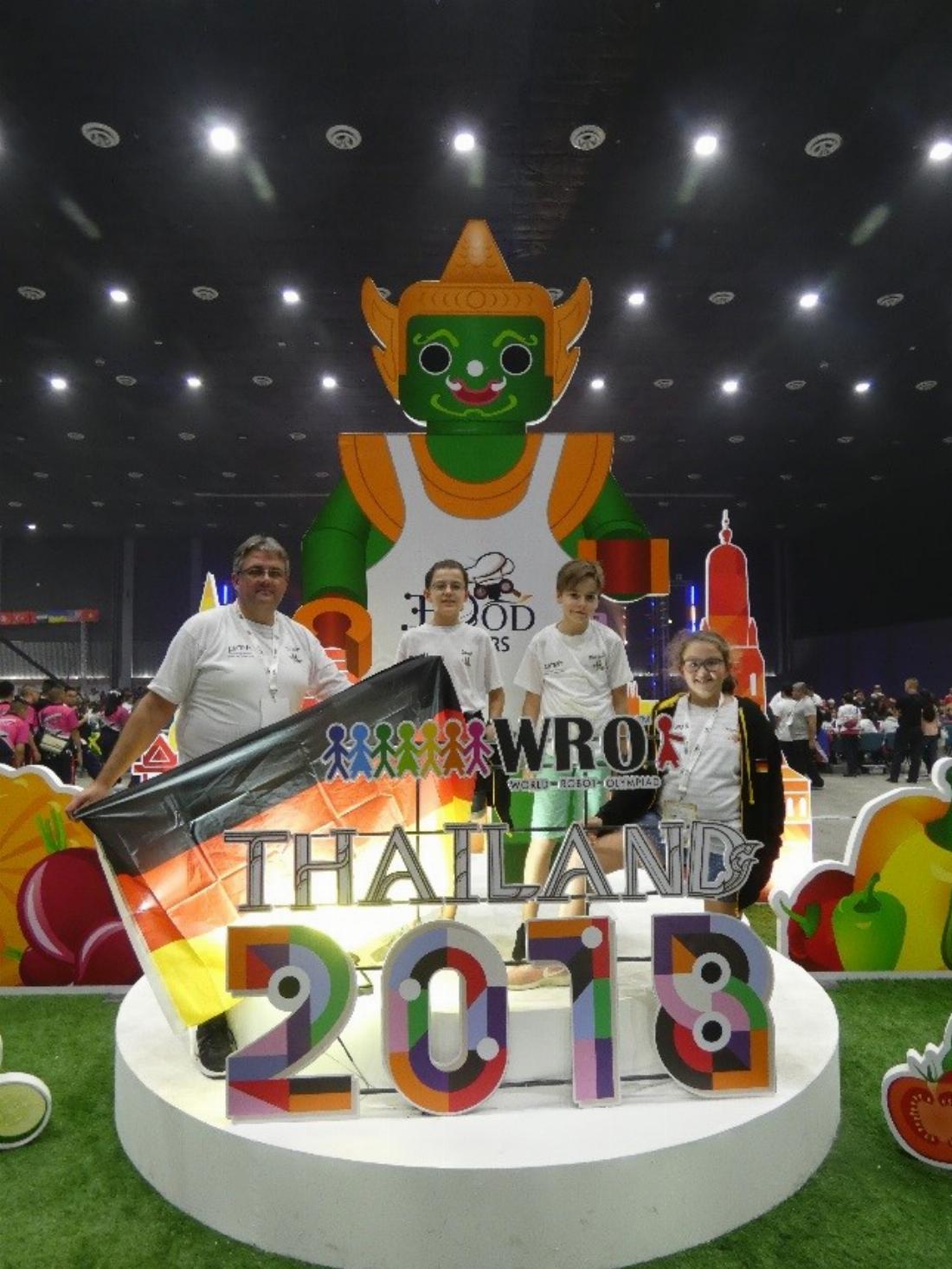 Somit starten wir gut gelaunt nach Passau zum Deutschlandfinale. Der Roboter ist auch besser geworden, die Sensorpositionen wurden verändert und die Programmierung ebenfalls. Wir schlafen nicht besonders gut und so gehen wir am ersten Morgen mit tiefen Augenringen, aber voller Vorfreude in die Dreiländer-Halle. Ganz viele nette Teams, die Berliner am Tisch neben uns sind super nett. Los geht’s  - erster Lauf: 80 Punkte – Naja. Zweiter Lauf: enttäuschende 40 Punkte von 170, Platz 6. Der Abend ist gelaufen. Zur Aufmunterung geht unser Team noch in ein Burger-Restaurant. Die Burger kommen, aber einer fällt der Bedienung in Slow-Motion auf den Boden. Auch das noch, wo wir doch so hungrig sind. Wir sind geknickt und schlafen dann auch schlecht. Kann es noch schlechter werden? Ja, am nächsten Morgen beim dritten Durchgang läuft es wirklich noch schlechter: nur 10 Punkte. Es sieht nicht gut aus. Dann, der letzte Lauf. Die ersten Früchte werden richtig sortiert – Hälfte geschafft. Aber dann, oh Nein, eine gelbe Frucht kippt um. Der Roboter dreht sich und, wie es der Zufall will, kommt mit seinem Hinterteil an den gelben Stein und stellt ihn wieder auf. Botti kommt auch noch ins Ziel und hat volle Punktzahl: 170. Zweiter Platz und: WIR FAHREN NACH THAILAND. Das Drehbuch für Passau hätte nicht spannender geschrieben werden können.