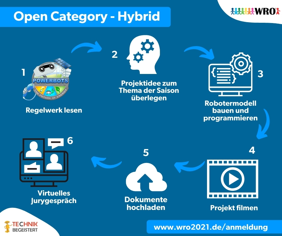 Die Open Category ist aufgrund der umfangreichen Projekte meist mit einer langen Aufbauzeit verbunden. Ebenfalls ist es langjähriger Bestandteil der Kategorie die eigene Roboterprojektidee am Wettbewerbstag anderen Teams oder Besuchern zu erklären. Wir halten die Open Category gut in einem hybriden Kontext durchführbar und haben uns daher entschieden, zur Saison 2021 ausschließlich hybride Wettbewerbe der Open Category anzubieten. Dies bedeutet konkret: